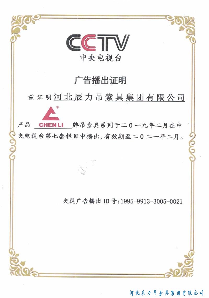 專注品質(zhì),誠信為本,辰力吊索具。 辰力牌吊索具系列于2019年2月在***電視臺(tái)第七套欄目播出,有效期2021年2月。